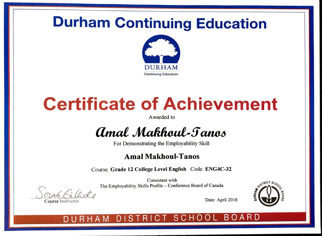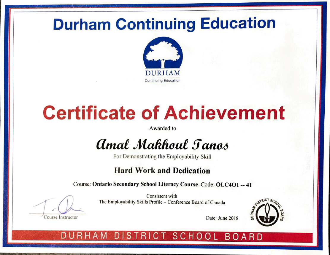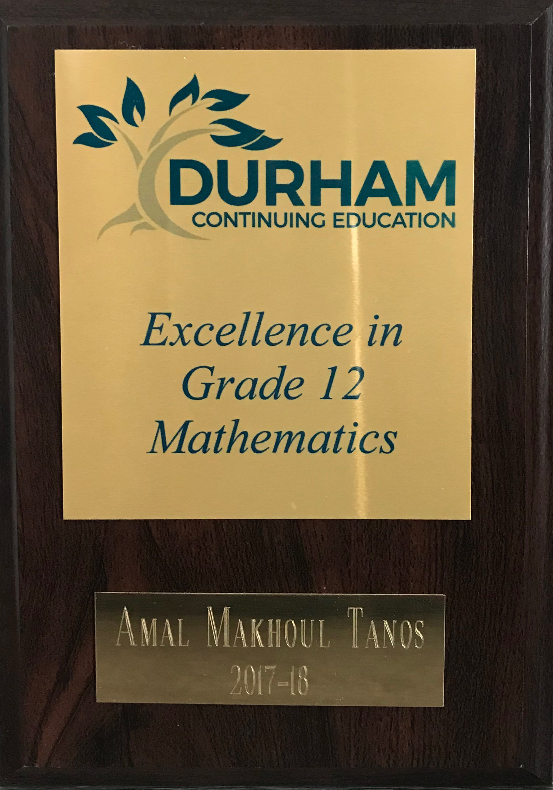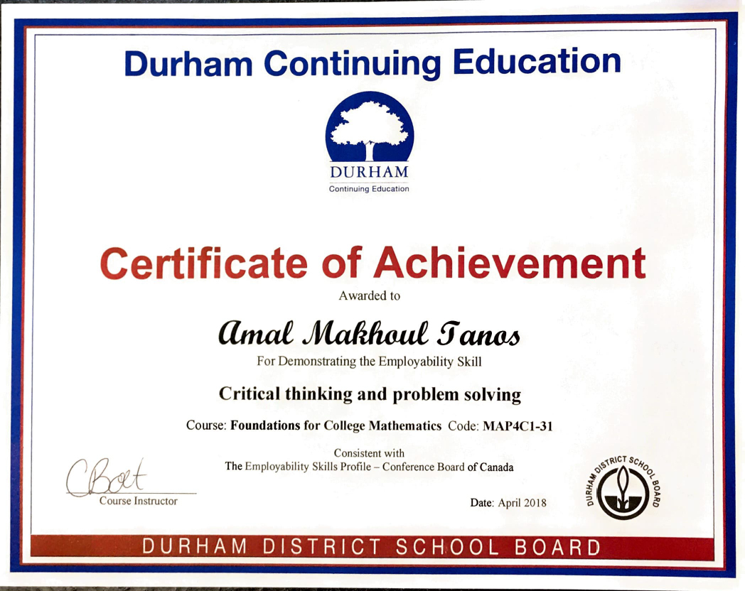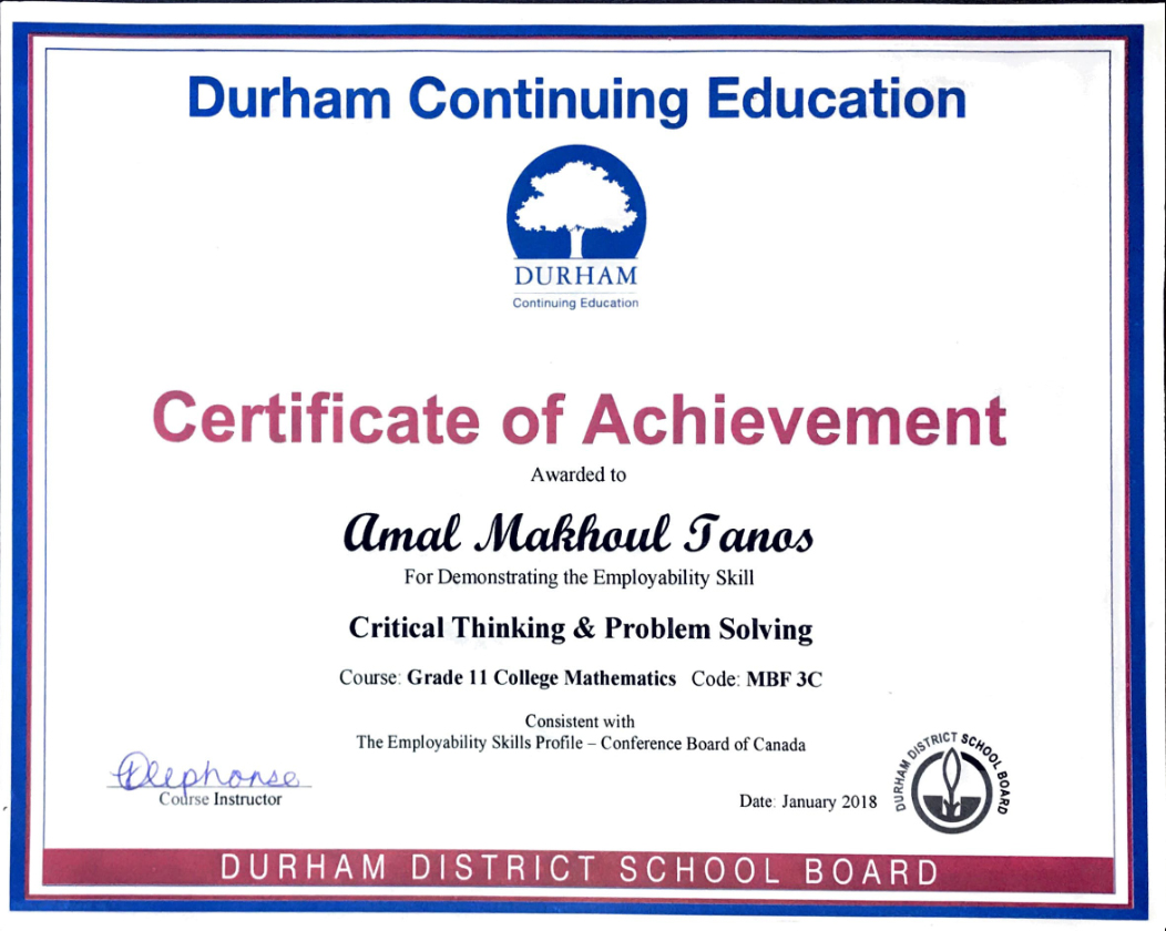 • Ontario Secondary School Diploma | Durham Continuing Education | Math Average 100% | 2018
